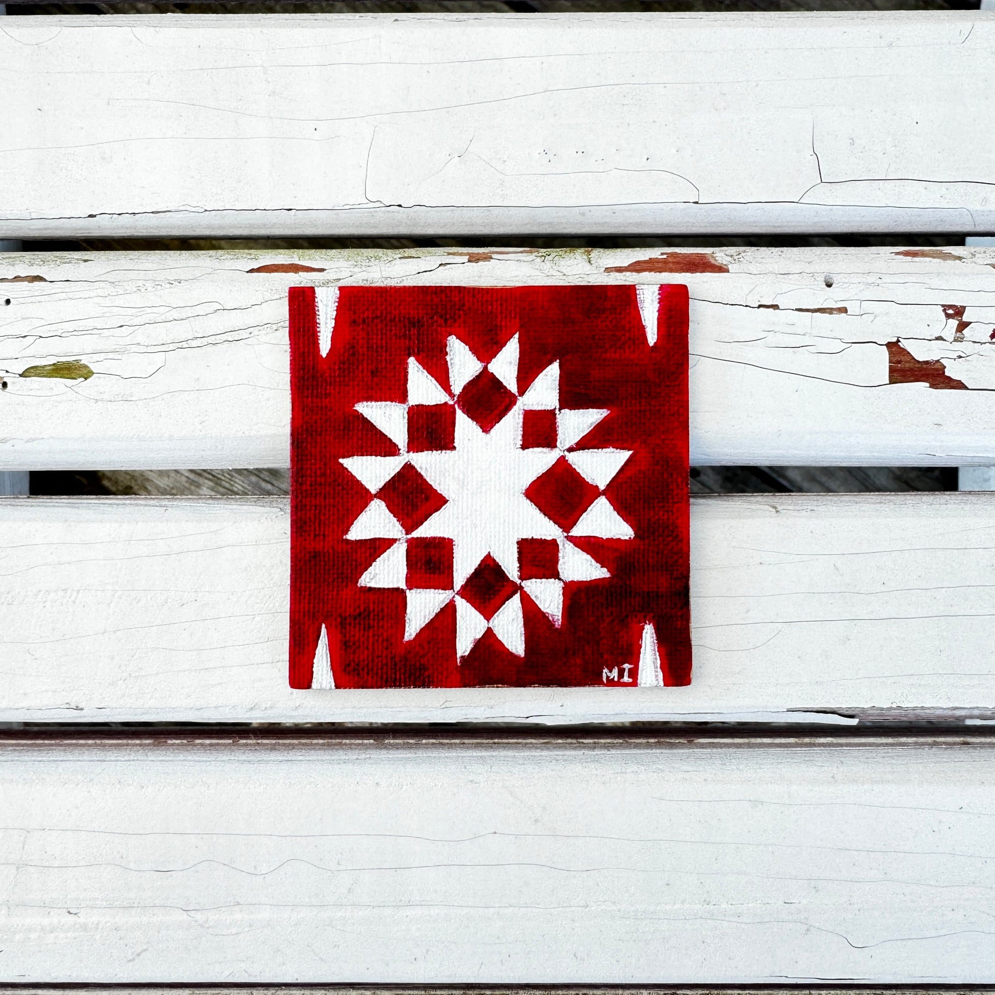 ”Barn Quilt” is an acrylic painting on canvas magnet featuring a western red and white quilt block. This canvas magnet measures 3 inches in length and 3 inches in width.