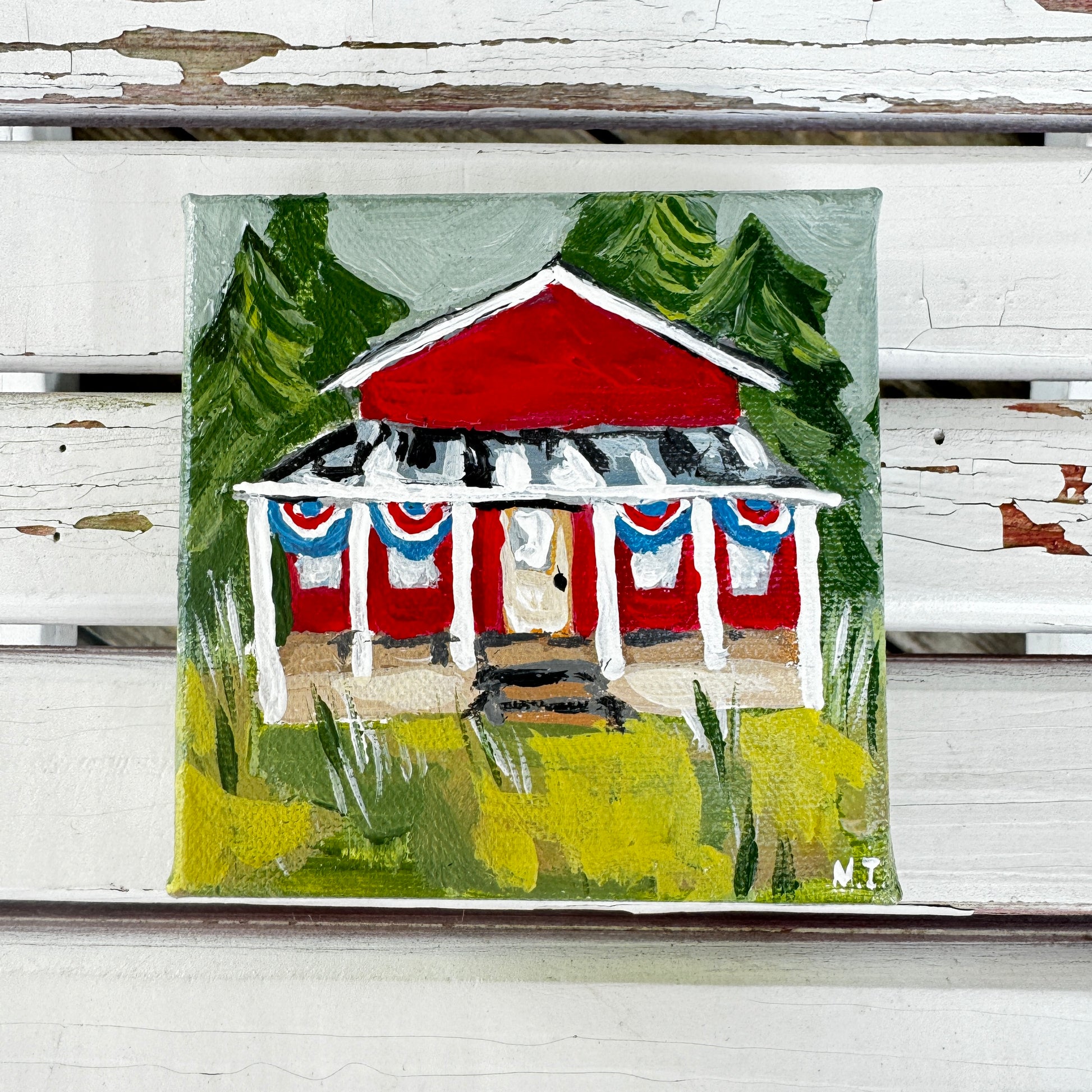 “In the Woods” is an acrylic painting on canvas featuring a red cabin hidden in a pine forest. This canvas measures 4 inches in length and 4 inches in width.