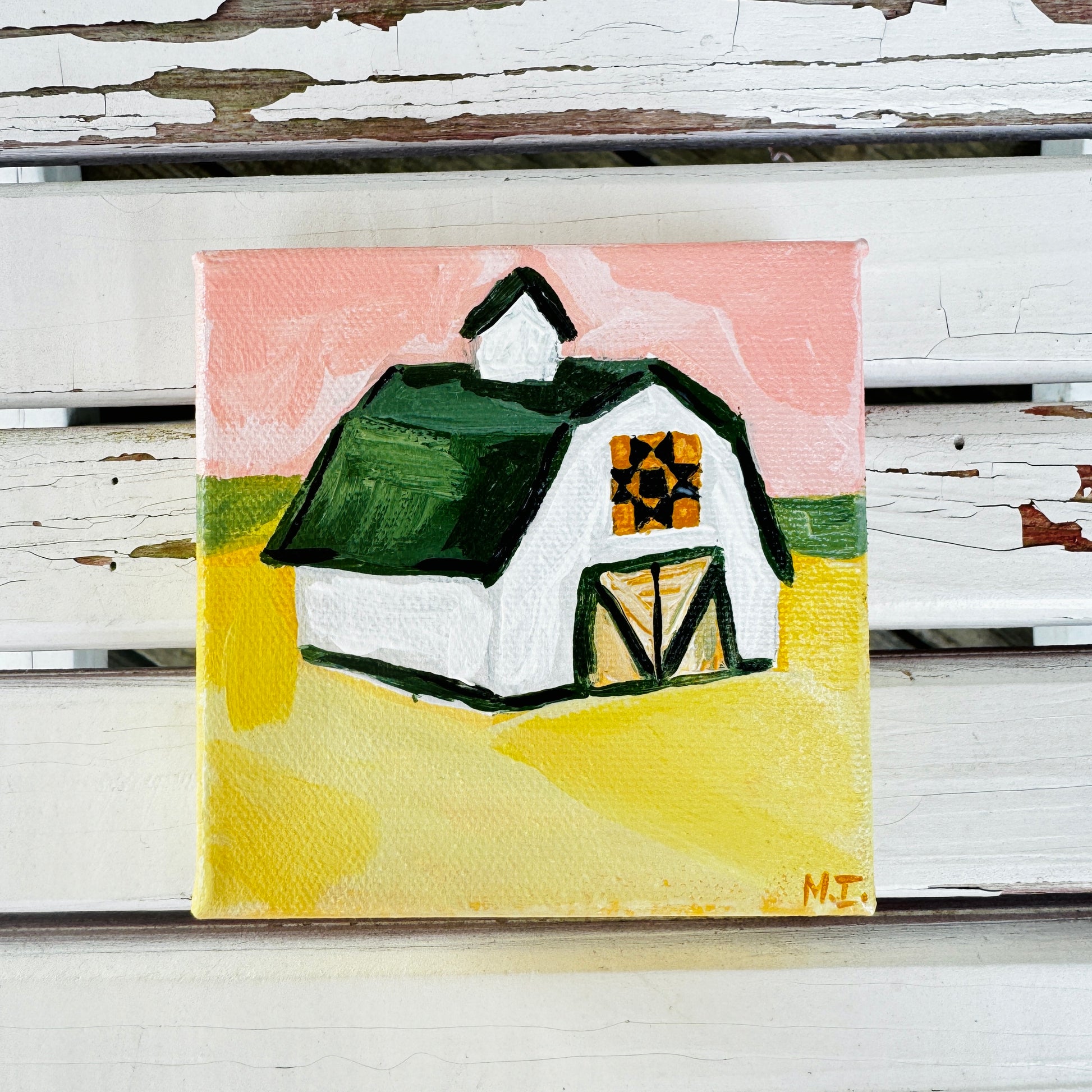 “Sunset on the Plains” is an acrylic painting on canvas featuring a quaint white barn at sunset surrounded by plain-lands. This canvas measures 4 inches in length and 4 inches in width.